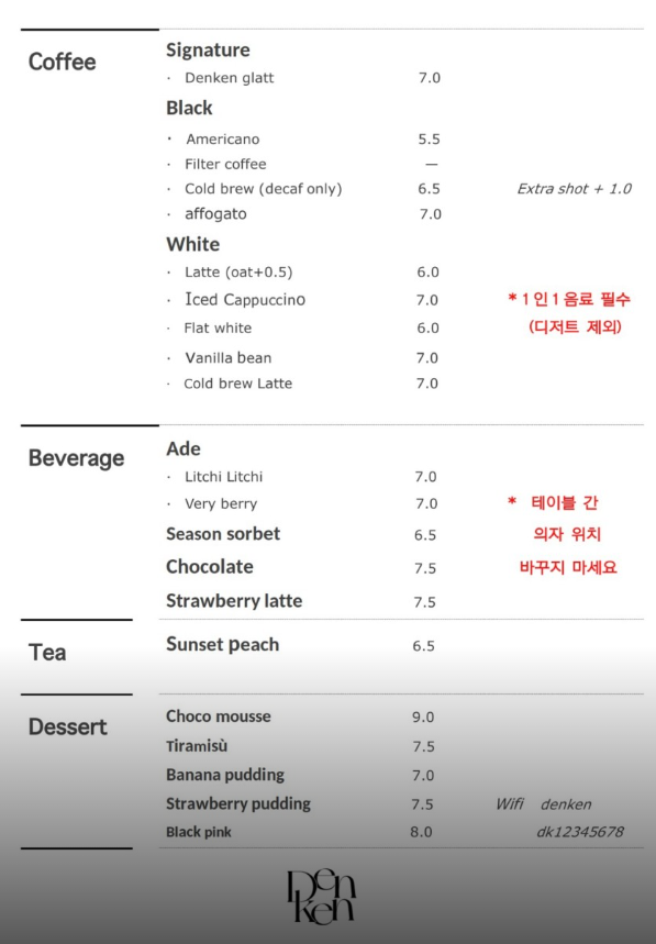덴켄은 단순한 카페를 넘어 하나의 예술 작품과 같습니다. 입구부터 내부까지, 모든 공간이 세심하게 디자인되어 방문객들의 눈을 즐겁게 합니다. 특히, 벽면을 장식한 추상화와 은은한 조명은 덴켄만의 독특한 분위기를 완성합니다. 테이블과 의자 하나하나에도 모던하고 미니멀한 디자인이 적용되어, 앉아있는 것만으로도 감각적인 경험을 선사합니다. 덕분에 어디에 앉든, 어떤 각도에서 사진을 찍어도 마치 화보의 한 장면처럼 연출될 수 있습니다. 덴켄은 단순한 음료를 판매하는 곳이 아니라, 시각적인 즐거움과 영감을 동시에 제공하는 공간으로, 방문객들에게 잊지 못할 추억을 선사합니다.