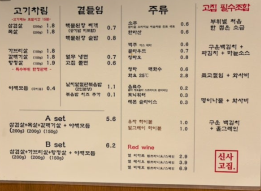 메뉴판은 아래와 같습니다. 메인 메뉴는 역시 삼겹살 목살이네요.