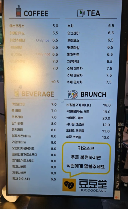 메뉴는 아래와 같이 매우 다양해요. 커피 뿐만이 아니라 수제 대추차, 레몬차, 유자차 등도 맛이 괜찮으니 참고하세요!!