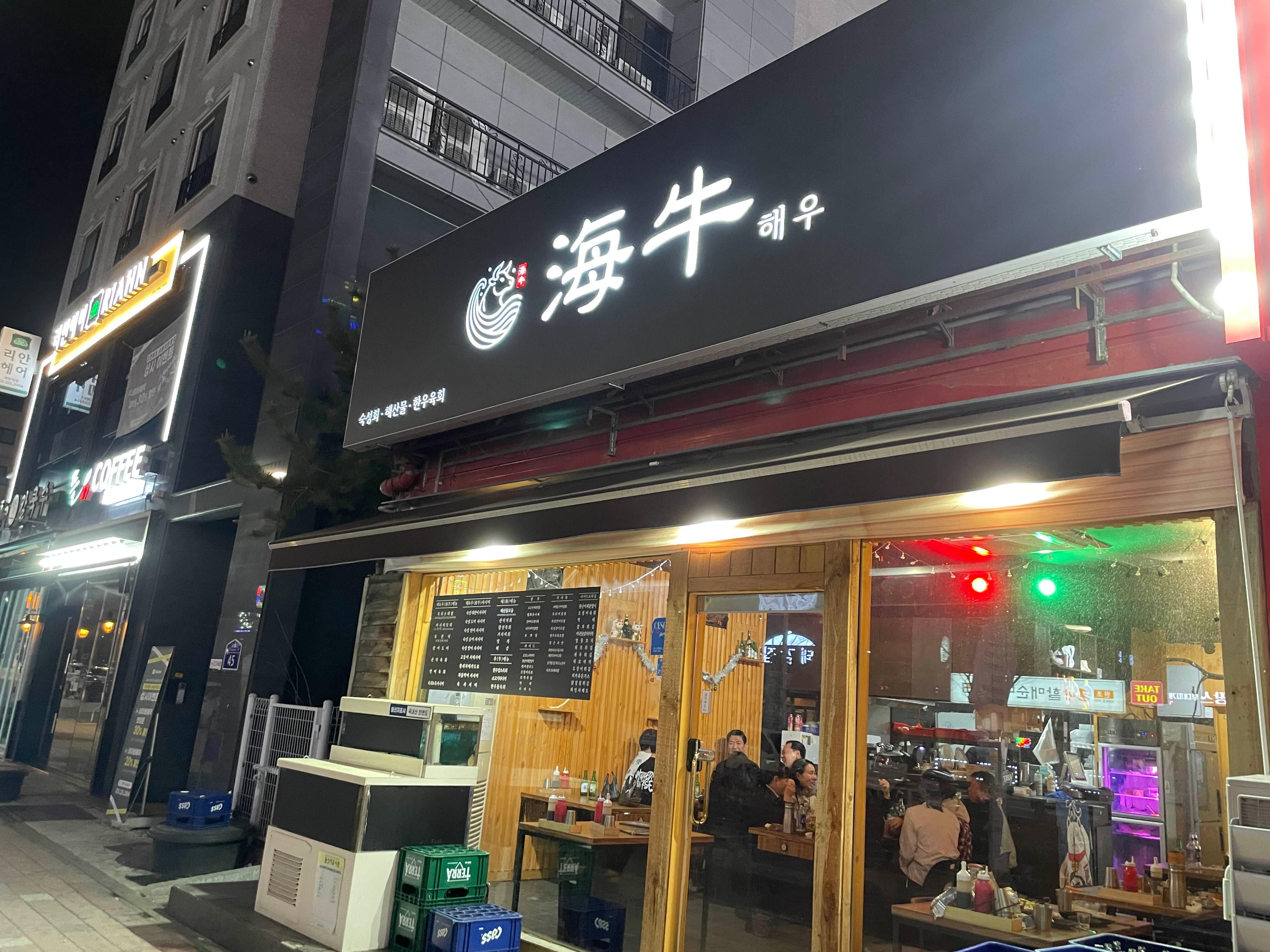 해우의 가게 앞 모습입니다. 간판이 세련되고 심플하게 검정색 배경, 하얀색 글씨로 되어 있어요.